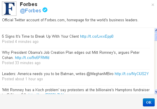 Wenn man sich nicht sicher ist, kann man mittels „Preview“ vorher die Tweets des gewünschten Informationskanals ansehen: