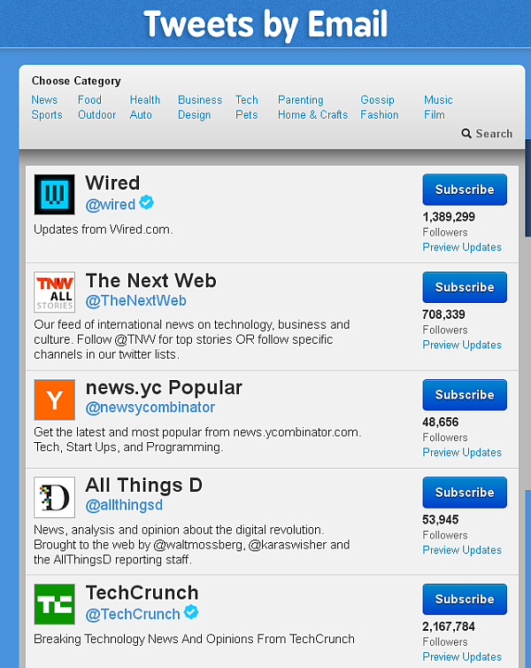 Zurzeit ist der Tweets von Twitterkonten per E-Mail Dienst noch im Beta Stadium und ich sehe schon viele namhafte Medienunternehmen vertreten.