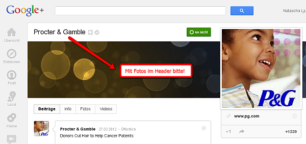 Wer eingekreist werden möchte, sollte das Profil (Person) oder die Seite (Unternehmen) ausgefüllen (Infos im Tab), aktuelle Inhalte posten und Fotos (im Header und mit Profilfoto) hochgeladen haben. So wie hier, bitte nicht (Stand: 21.9.2012):