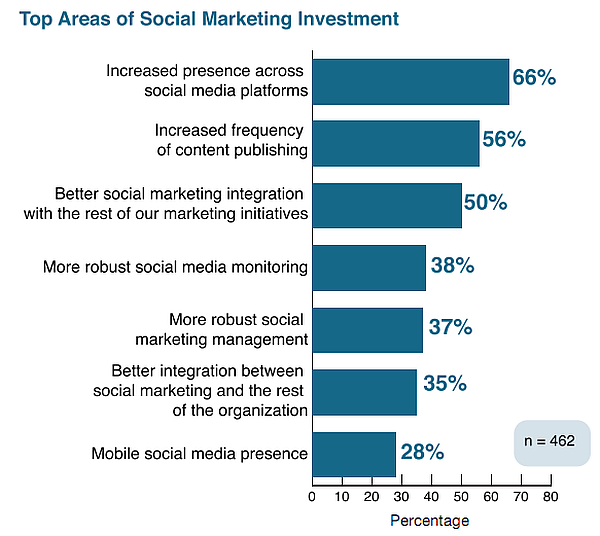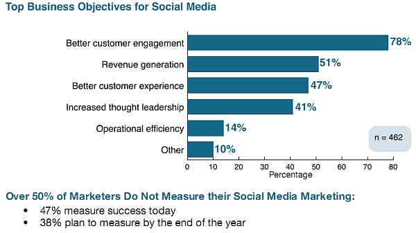 Die Studie stellte fest, dass das vorrangigste geschäftliche Social Media Ziel ist, bessere Interaktionen (Engagement) mit Kunden zu führen. Bisher haben sich 66% der Social Media Marketer auf das Sammeln von mehr Fans und Followers konzentriert, um mehr Reichweite aufzubauen. Auf dem zweiten Platz (51%) stehen Umsatzgenerierung, gefolgt von bessere Kundenerlebnissen schaffen (47%), durchdachte Führung (41%) und die operative Effizienz zu steigern (14%).