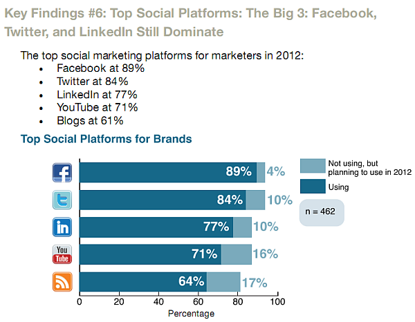 Die meist genutzten Platformen sind 1.Facebook (89%), 2.Twitter (84%), 3.Linkedin (77%), YouTube (71%) und Blogs.