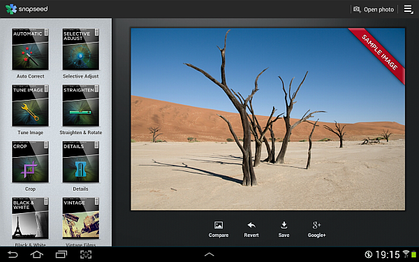 Google startet zur gleichen Zeit auch mit der mobilen App Snapseed (Android) für kunstvolle Fotos, welche im Vorjahr zur iPad-App des Jahres gewählt wurde und von Google gekauft wurde. Sie beinhaltet: