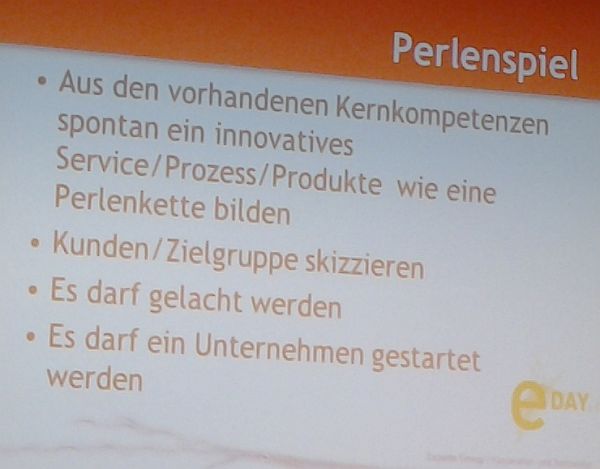 Nachdem den Besuchern des Workshops der Nutzen und die Erfolgsfaktoren bei Kooperationen und Netzwerken aufgezeigt wurde, bat man die Teilnehmer sich auf 8.Tischen einzufinden. Jeder Tisch bekam die Aufgabe innerhalb von 15 Minuten eine marktreife Geschäftsidee gemeinsam mit den anderen Anwesenden (Perlen von Kompetenzen) zu entwickeln.