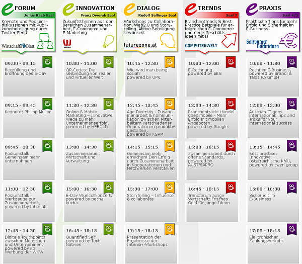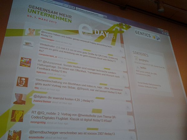 Beim E-Day 2013 wurden in allen 5 Vortragsräumen Twitter Walls für die Kommunikation während der Veranstaltung von Besuchern genutzt. Günter Exel von Travelife hat via Twitter eine komplette Livereportage vom E-Day 2013 mit dem Hashtag #eday13 erstellt. Mehr dazu ins seinem Blogartikel und sein Kurationstool Storify.