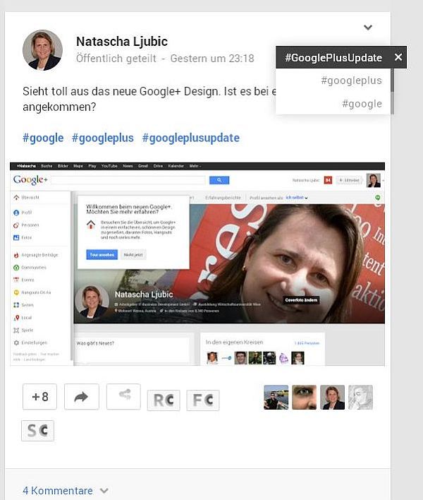 Der Hashtag im Beitrag wird zum Suchwort für gleiche oder verwandte Begriffe und zeigt weitere Beiträge an. Beim Hashtag #googleplusupdate erscheint bei mir: