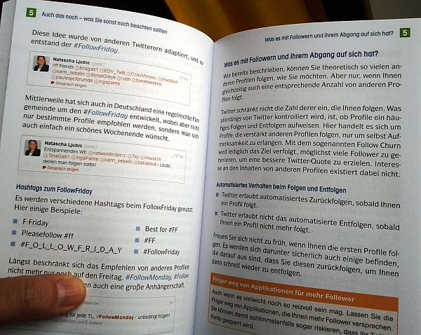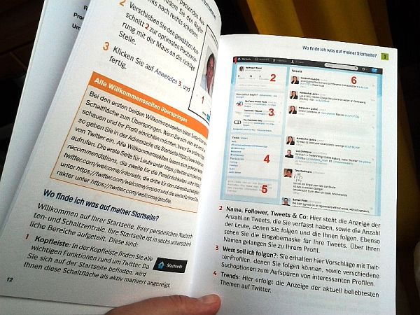 Gleich auf Seite 13 (von 160 Seiten insgesamt) wird mein Twitterkonto benutzt um zu erklären, was man auf der Twitter Startseite findet: