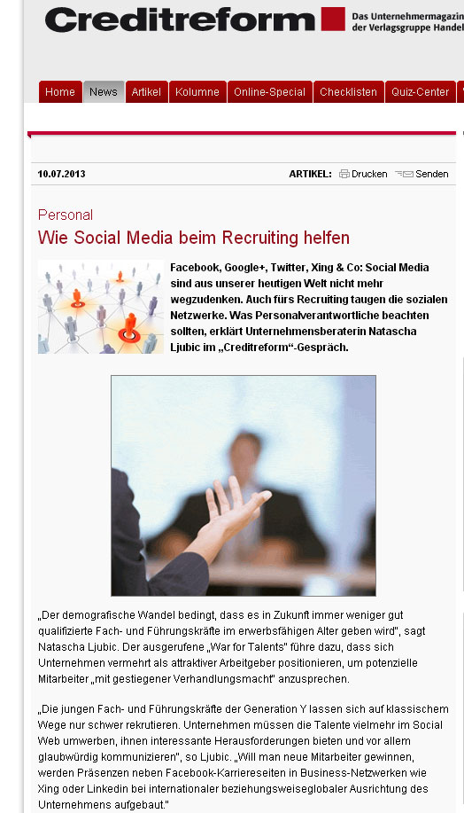 Creditreform, das Unternehmermagazin aus der Verlagsgruppe Handelsblatt fragte mich nach Tipps rund um die Personalsuche in den sozialen Medien. Social Media ist aus unserer heutigen Welt mit Facebook, Google+, Twitter, Xing & Co kaum mehr wegzudenken. Kommunikation und Interaktionen mit Freunden und Bekannten, Unternehmen und Geschäftspartnern gehören zum täglichen Alltag. Der demografische Wandel bedingt, dass es in Zukunft immer weniger, gut qualifizierte Fach- und Führungskräfte im erwerbsfähigen Alter geben wird.