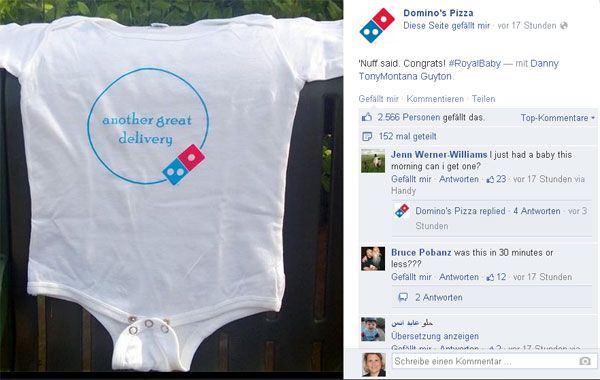 Der Pizzalieferant Dominos bietet Strampelanzug im Corporate Design und bekommt 2.600 Likes und 152 Shares: