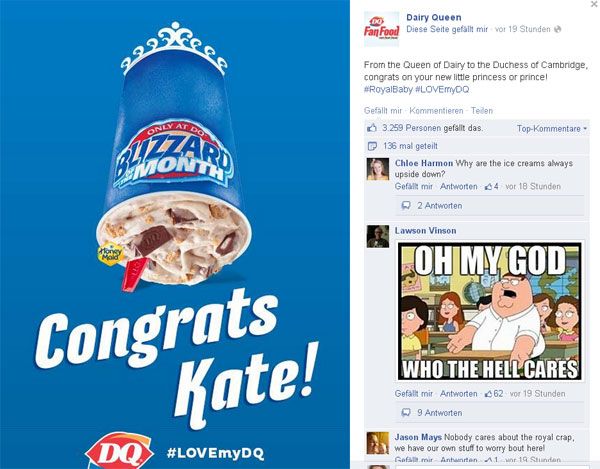Der Eiscremehersteller DairyQueen gratuliert Kate mit einem Eis und bekommt über 3.000 Likes und 136 Shares auf Facebook
