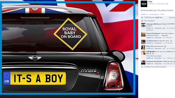 Mini Cooper gratuliert auf der Facebook Seite den Eltern des Royalen Prinzen mit „Royal Baby on Board“ Aufkleber am Auto und fast 4.000 Leuten gefällt das.