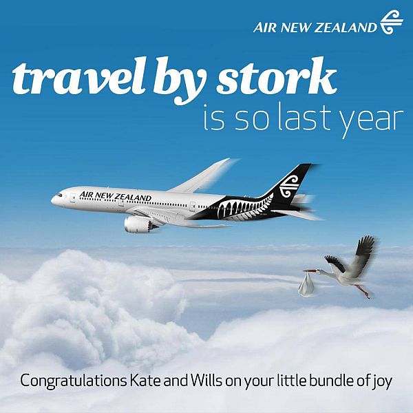 Die Fluglinie Air New Zealand gratuliert mit dem Storch im Corporate Design und bekommt 1300 Likes und über 600 Shares: