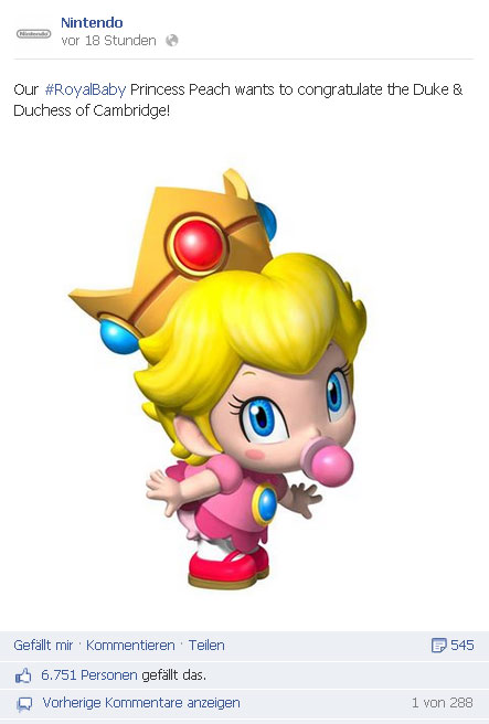 Nintendo gratuliert via Prinzessin Peach auf Facebook den glücklichen Eltern und erhält über 6.000 Likes und 600 Shares:
