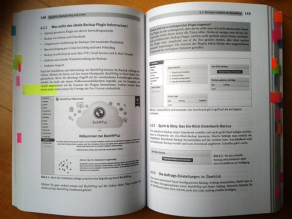 Auf die WordPress Installation wird grundsätzlich verzichtet, was ich gut finde! Sie ist ohnehin sehr gut dokumentiert bei WordPress. Es gleich mit einer Erklärung von WordPress Funktionen und Einstellung im Administratorbereich mit einer großen Anzahl an guten Tipps los! Mich hat das Kapitel 6 mit der richtigen Sicherung von WordPress begeistert! Es werden unterschiedliche Möglichkeiten des sicheren Back-ups mit viel Praxiserfahrung aufgezeigt und gut erklärt. Ich habe mich dann für danach sofort für das BackWPup Plugin entschieden.