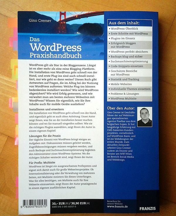 Das nagelneue WordPress Praxishandbuch von Gino Cremer ist einfach perfekt für die Pflege und Wartung eines Corporate Blogs. Ich lernte Gino Cremer auf Twitter kennen, als ich ein Problem mit einem Plugin hatte. Als Geschäftsführer der Agentur Pixelbar in Belgien hat er mir mit seinem umfangreichen Praxiswissen rasch und unkompliziert helfen können. Als er mir erzählte, dass er gerade beim Fertigstellen seines WordPress Handbuches für Praktiker war, musste ich das Buch unbedingt haben. Die fast 350 Seiten im geschmeidigen Softcover liegen extrem gut in der Hand und lesen sich sehr gut!