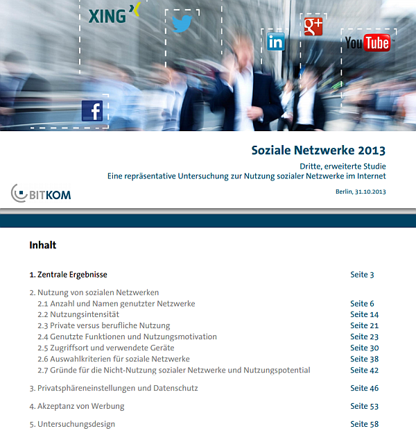 Die Nutzung sozialer Netzwerke in Deutschland wird als Studie der Bitkom - hier als pdf Download angeboten.