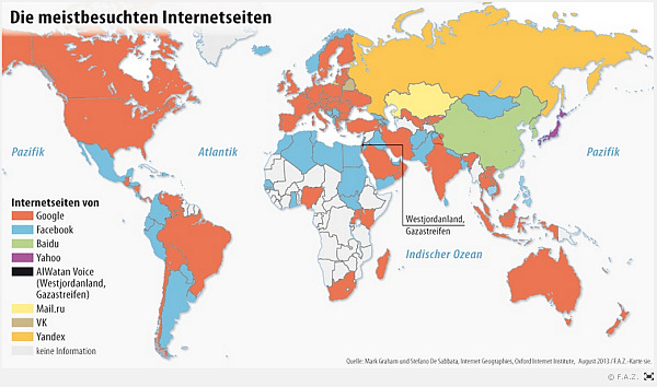 Die FAZ Weltkarte teilt die meistbesuchten Webseiten in Google, Facebook, Baido, Yahoo und andere auf: