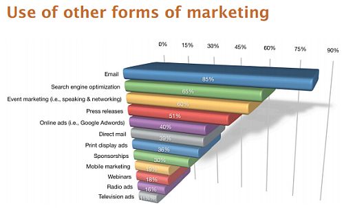 Weitere Marketing Werkzeuge, die bei Unternehmen im Einsatz sind E-Mail, SEO, Event Marketing, Presseveräffentlichungen, Werbeanzeigen, Newsletter, gedruckte Werbung, Sponsoring, mobiles Marketing, Webinare, Radio und TV Werbeanzeigen.