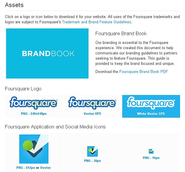 Foursquare Richtlinien und Assets für die Verwendung der Marke Foursquare im Web findet man unter Foursquare Resources and Logos.