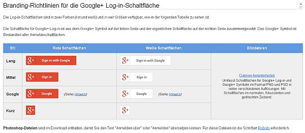 Unter Google+ Branding Richtlinien findet man Google+ Schaltflächen, Badges, Google+ Boxen etc. zur Integration in Anwendungen, Websites etc. von Unternehmen damit Nutzern eine Verbindung zu Google+ herstellen können. Weitere Google Identitätsangaben findet man unter Google Assets.
