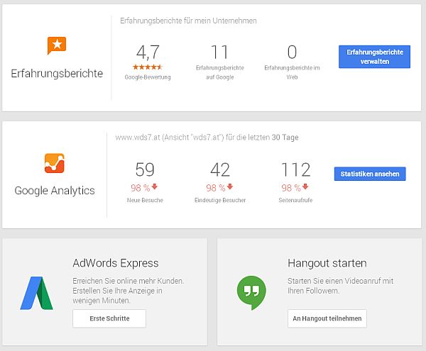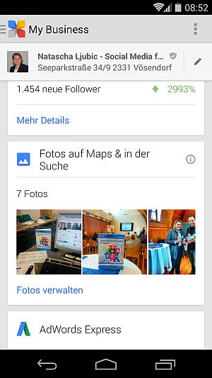 Für Android Nutzer gibt es jetzt schon eine mobile App „MyBusiness“ - iphone Nutzer müssen noch ein wenig warten. Neben den Details zum Unternehmen auf Google Plus, wie Statistiken, Fotos von Google Maps - kommt man auch zu den Werbeanzeigen - Adwords Express.
