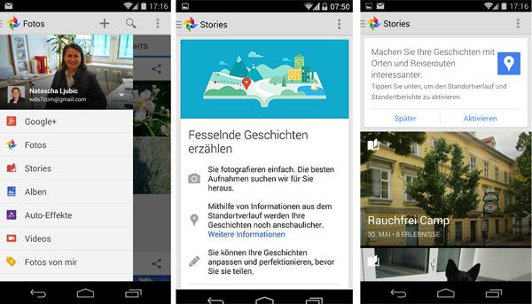 Hat man die “automatische Sicherung” seiner Fotos und Video am mobilen Gerät aktiviert, macht Google nicht nur ein Backup von allen Inhalten sondern bietet neben automatischer Bildoptimierung, Auto-Effekten, Auto-Highlights (sucht die besten Fotos als “Highlight” heraus) - nun auch Stories an. Unter Take a Tour werden die Funktionen erklärt.