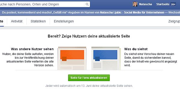 Spätestens am 13.Juni 2014 werden angeblich alle Facebook Seiten umgestellt. Administratoren haben bis dahin Zeit sich an die Umstellungen anzupassen. Klickt man oben auf „Seite für Fans aktualisieren“ sehen auch die Fans das neue Design. Ich habe es für euch schon einmal umgestellt.