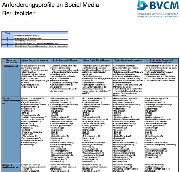 Zur Definition der verschiedenen Social Media Rollen empfehle ich bei Stellenausschreibungen immer die Definitionen des deutschen Bundesverbandes Community Management (BVCM) heranzuziehen. Hier wurden Anforderungsprofile für den Community-Manager (kümmert sich um die Communities der Marke), den Social-Media-Manager (Entwicklung und Umsetzung von Social-Media-Strategien sowie Überwachung der Ergebnisse) und den Social-Media-Consultant/-Konzeptionalisten/-Spezialisten (Bestandsaufnahme, strategische Konzepte, Vorgabe von SMART-Zielen) entwickelt.