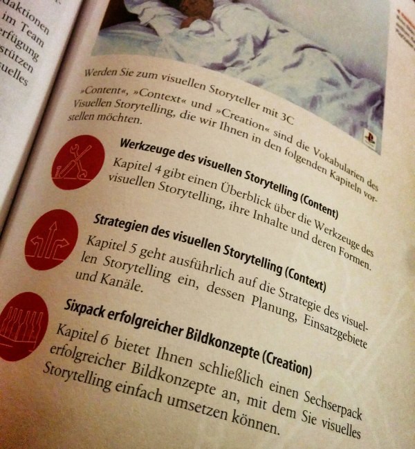 Das Erzählen von Geschichten ist eine der ältesten Überzeugungsstrategien überhaupt. Im Buch gibt es einen Überblick zu den Content Werkzeugen des visuellen Storytellings, wie z.B. Infografiken; Strategien (Context) und ein Sixpack für erfolgreiche Bildkonzepte zur Kreation klären auf. Es werden zu den unten stehenden Kategorien jeweils Unternehmensbeispiele gezeigt.